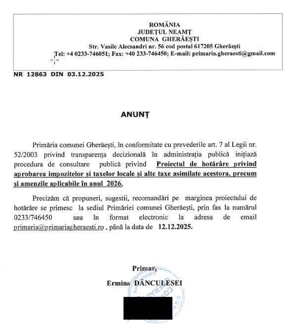 Invităm persoanele fizice şi juridice interesate să depună în scris propuneri, sugestii sau opinii cu privire la proiectul de hotărâre arătat mai sus, al cărui conţinut se află afişat pe site -ul primăriei comunei GHERĂEŞTI, judeţul Neamţ, la sediul acesteia, precum şi la secretariat.